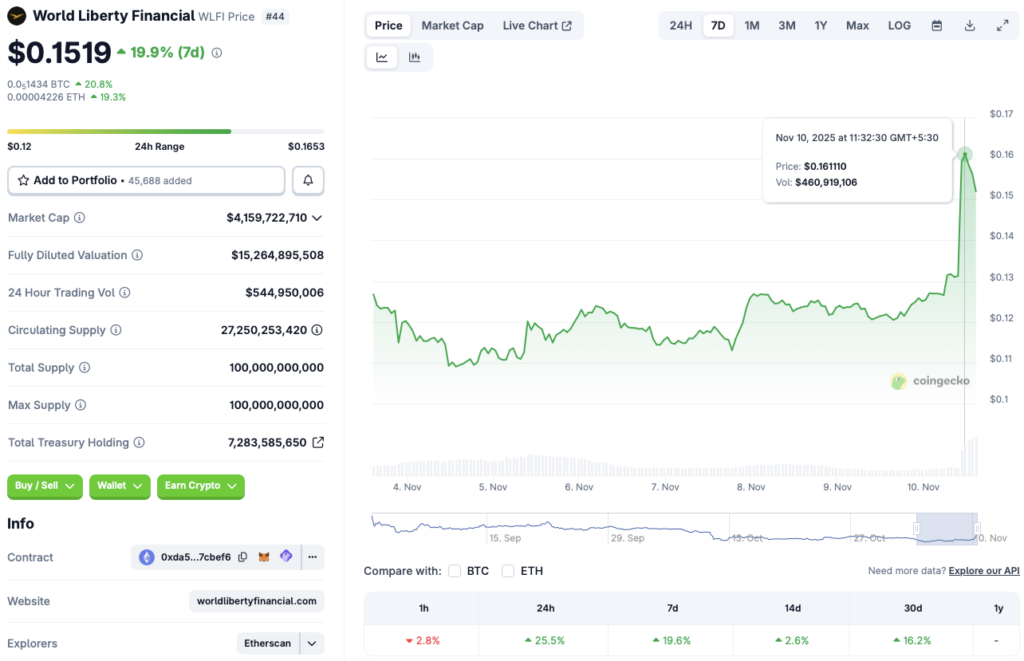 From a pure price action standpoint, WLFI still has a long way to go if it wants to reclaim its peak. Sitting 52.7% below its all-time high of $0.3313, the asset would need an extended continuation of the current trend to print fresh records. If the current momentum persists, it’s not crazy to imagine another leg higher that tests or even exceeds that level, especially if the broader market stages a clean rebound from October’s wipeout.