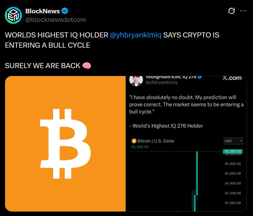 YoungHoon Kim — who claims an IQ of 276, the highest recorded globally — is making one of the boldest Bitcoin predictions of the year. Kim says BTC will hit $220,000 within the next 45 days, and he’s so confident that he has reportedly moved all of his personal wealth into Bitcoin. He argues that BTC is on track to become the global reserve asset, replacing outdated monetary systems as institutions continue shifting into digital stores of value.