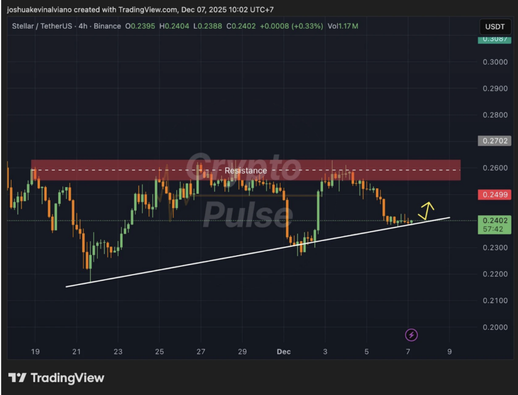 Crypto analyst Crypto Pulse pointed out that XLM has been clinging to a strong 4H trendline support—one that has repeatedly pulled in buy orders whenever price dips too far. Each test of this level has triggered a short recovery, showing that demand still pops up when it matters.
