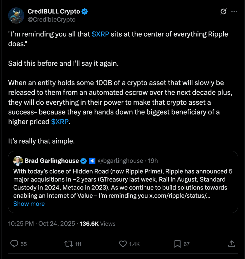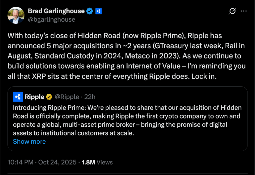On the fundamentals side, Ripple just finalized the acquisition of Hidden Road — now rebranded as Ripple Prime. This move officially makes Ripple the first crypto firm to operate a global, multi-asset prime broker, bridging traditional finance and blockchain infrastructure. Garlinghouse called it another step toward building the “Internet of Value,” adding that “XRP sits at the center of everything Ripple does.” The firm also announced plans to buy $1 billion in XRP for a new treasury under the Nasdaq ticker “XRPN,” boosting confidence among long-term holders.