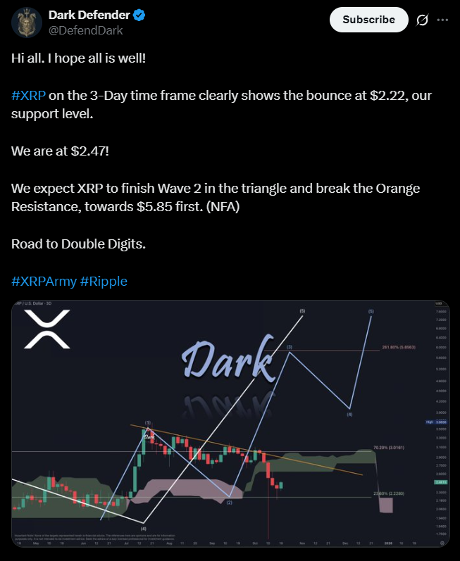 Dark Defender’s chart identifies $2.22 as strong support — where XRP recently bounced — and outlines $2.85 and $5.85 as the next key resistance levels. The analyst expects XRP to finish its current Wave 2 within this triangular structure before breaking upward, potentially initiating a rally toward the $5.85 target. He even hinted at a “road to double digits” in the longer term, suggesting broader optimism for Ripple’s price trajectory once the breakout is confirmed.