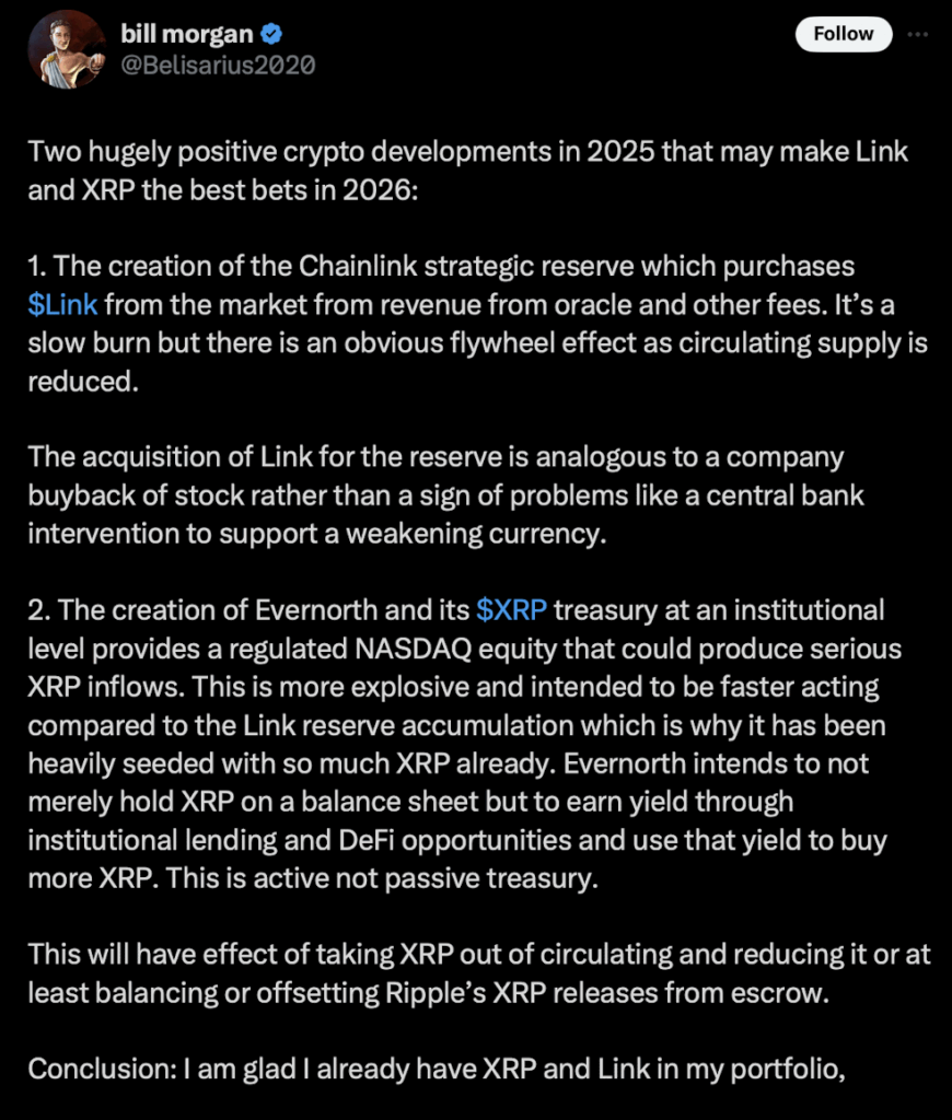 Pro-Ripple lawyer Bill Morgan believes both XRP and Chainlink (LINK) might be on track for standout performances in 2026 — thanks to two key developments unfolding in 2025. In a detailed post, Morgan explained how both projects are introducing mechanisms that could reduce circulating supply and strengthen long-term market health.