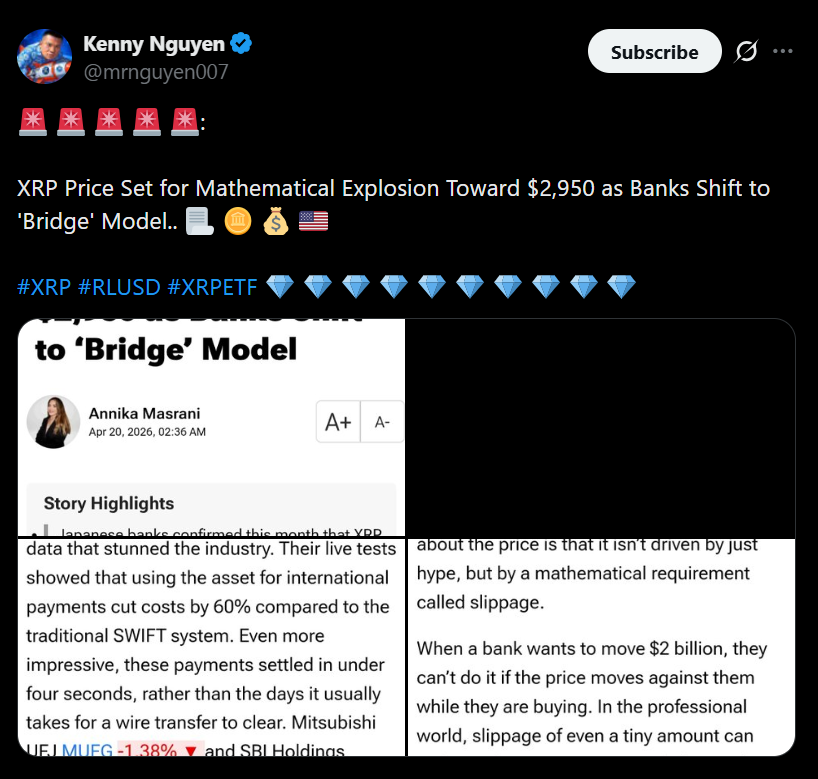 XRP is sitting at around $1.42 right now, but some analysts argue that number barely reflects its actual utility, especially on the institutional side of things. Kenny Nguyen, one of the louder voices in this conversation, believes XRP could reach as high as $2,950 under full-scale banking adoption, which sounds wild at first, maybe even unrealistic.