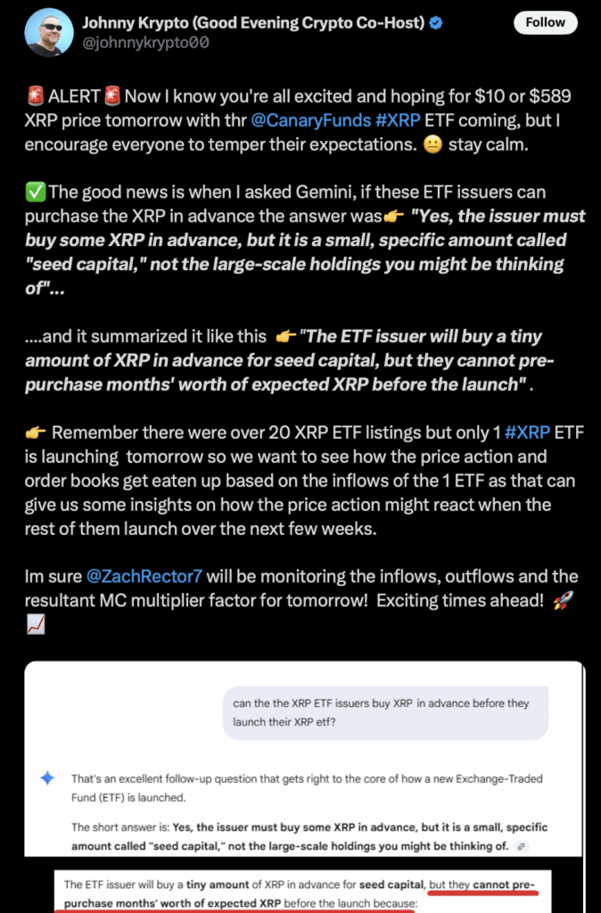 Johnny hopped on X to share a quick reality check, reminding investors that although the excitement makes sense, it’s better to just breathe a little and “stay calm.” He also brought up something he got from Google’s Gemini AI about how ETF issuers actually get their XRP before launch—a topic that’s caused a weird amount of confusion in the community.