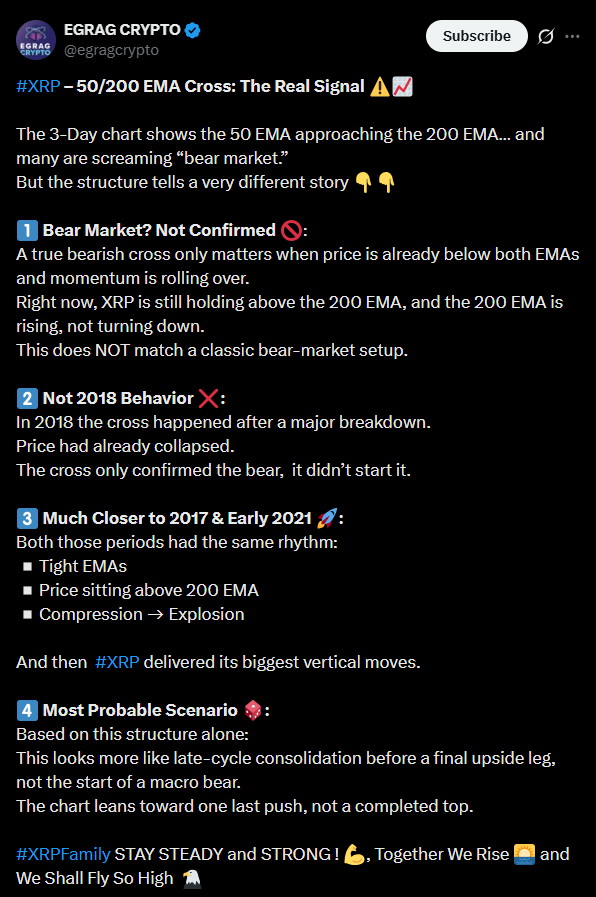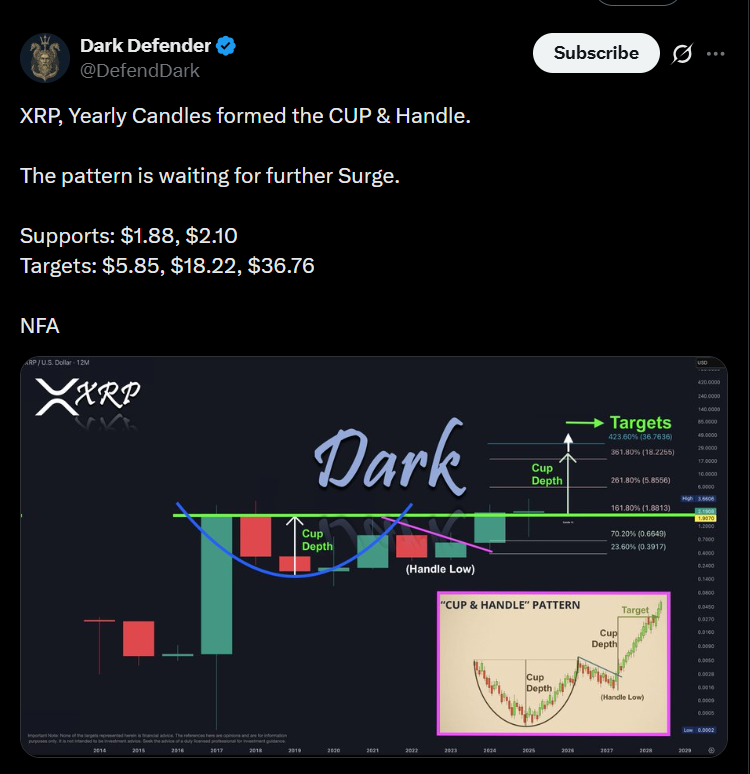 Despite the sluggish performance, some analysts are actually more bullish than ever. Dark Defender pointed out a large cup-and-handle structure forming on the yearly chart, something that doesn’t happen often. If that pattern fully plays out, he sees targets at $5.85, $18.22, and even $36.76. Egrag Crypto echoed a similar tone, calling XRP’s slow grind a standard consolidation phase before a bigger breakout. For these analysts, the silence is more of a buildup than a breakdown.