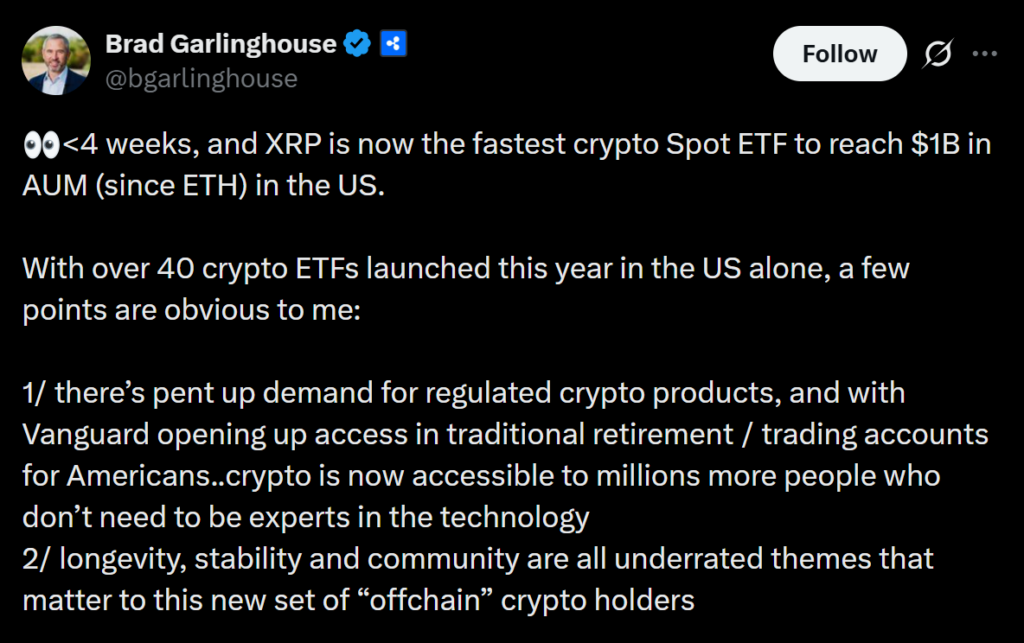 Brad Garlinghouse, CEO of Ripple, celebrated the ETF milestone on X, calling out the powerful shift taking place in US investor behavior. He emphasized that the speed at which XRP ETFs crossed $1B AUM demonstrates pent-up demand for compliant, accessible crypto investment vehicles. Garlinghouse also noted that platforms like Vanguard are now opening ETF access to millions of Americans who do not need technical expertise to participate in crypto markets. His remarks underline a broader trend: the newest wave of crypto investors value longevity, stability, and strong community foundations rather than speculative hype.