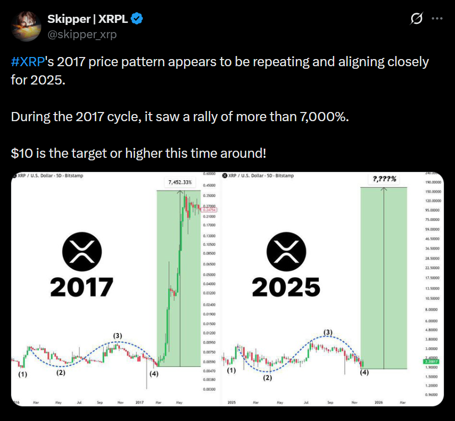 Skipper’s forecast suggests a potential move toward $10 or higher if the pattern continues to develop as expected. While price targets remain speculative, the bullish structure reinforces the growing optimism around XRP’s next major cycle.