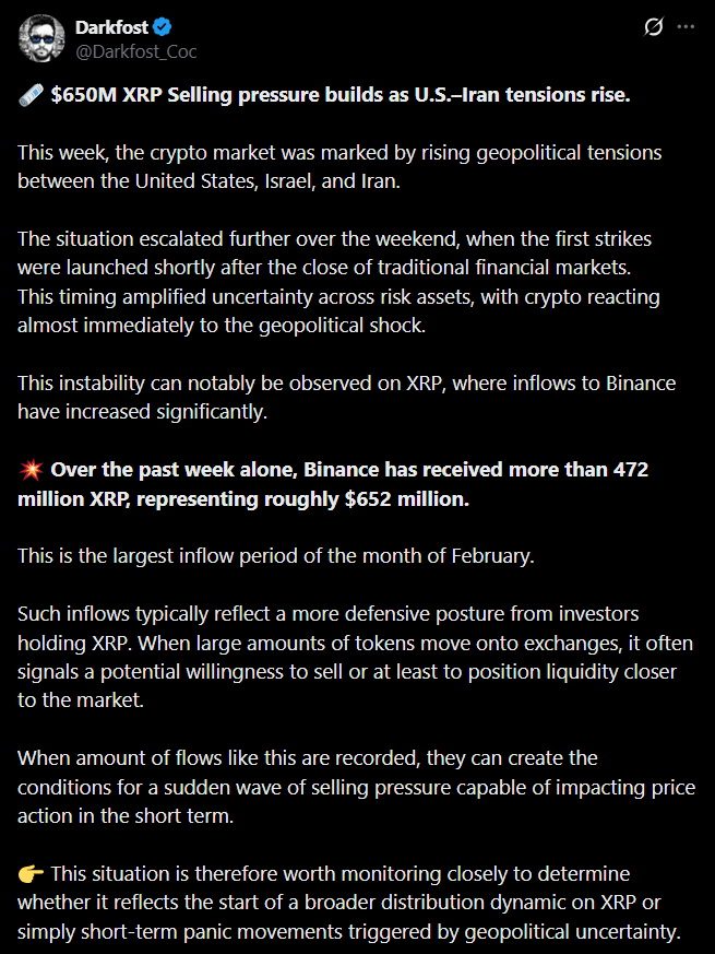 Amid this backdrop, CryptoQuant contributor Darkfost highlighted that more than 472 million XRP flowed into Binance. At current prices, that stash is worth roughly $650 million. In times of geopolitical stress, large exchange inflows often reflect caution rather than confidence.