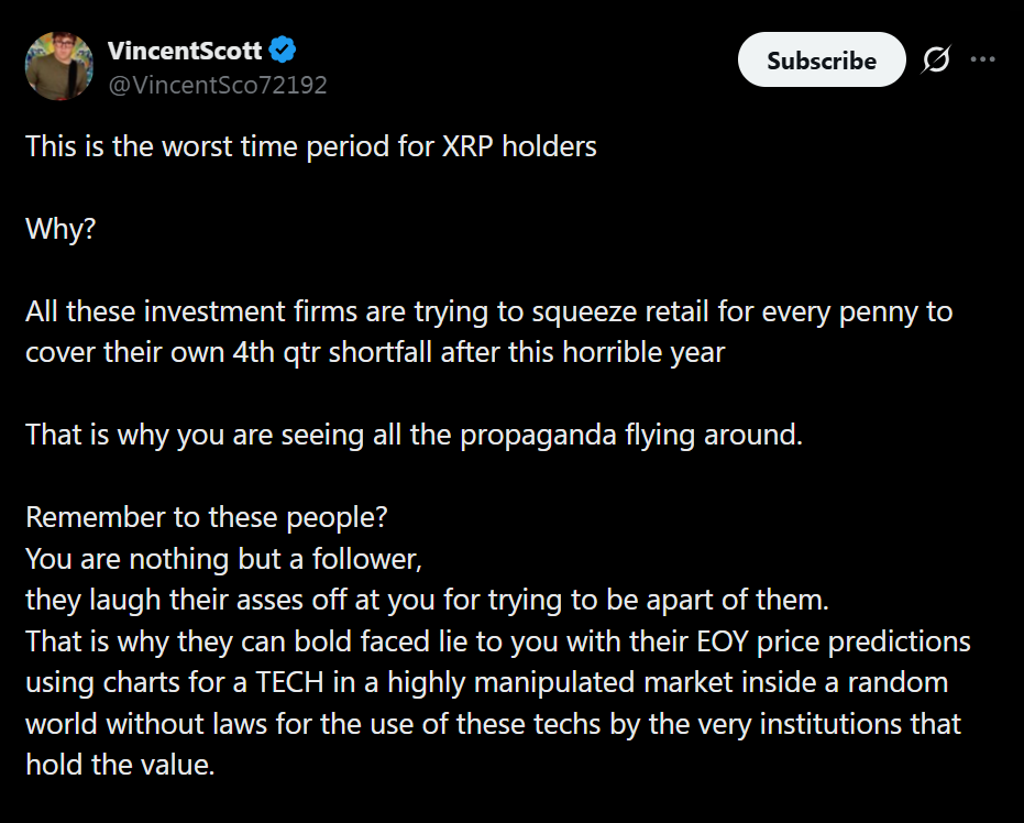 According to Scott, the current XRP downturn is being driven less by fundamentals and more by institutional behavior. He claims major players are deliberately pulling liquidity from retail participants to repair balance sheets after a poor year. This dynamic, he argues, explains the flood of aggressive narratives and emotional messaging surrounding XRP, which tends to peak during periods of stress rather than organic growth.