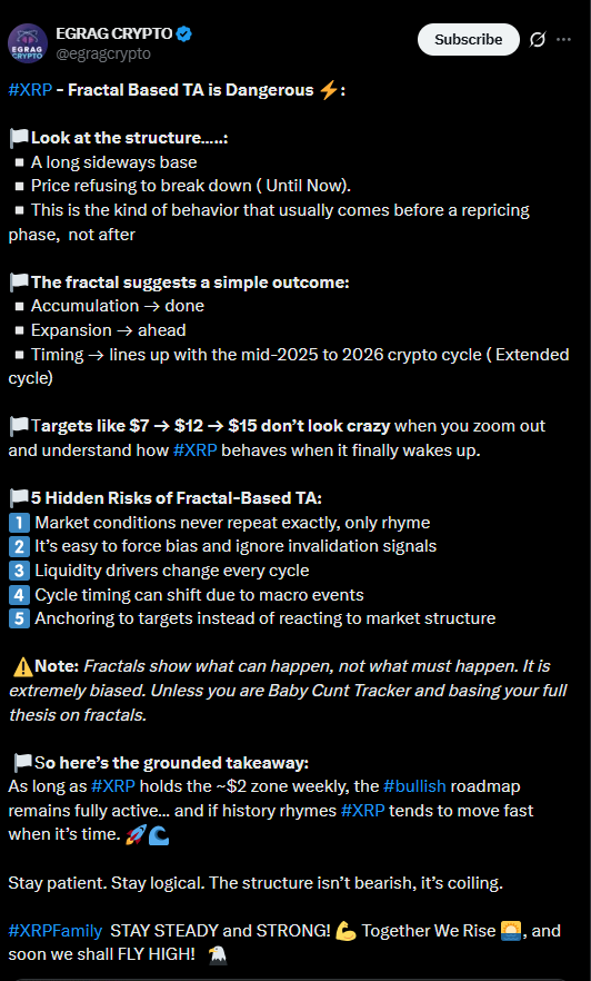 The two-dollar support has already been tested repeatedly this year, and its resilience is central to the bullish scenario. Market conditions across the crypto sector remain uncertain, but XRP has avoided falling into a classic bearish breakdown despite pressure. Still, EGRAG outlines several risks that come with fractal analysis, including timing variation, liquidity differences between cycles, and the tendency for bias when patterns appear too convenient. Even with these caveats, he maintains that XRP is coiling rather than weakening, and that a decisive expansion remains possible if broader crypto strength aligns with internal structure.