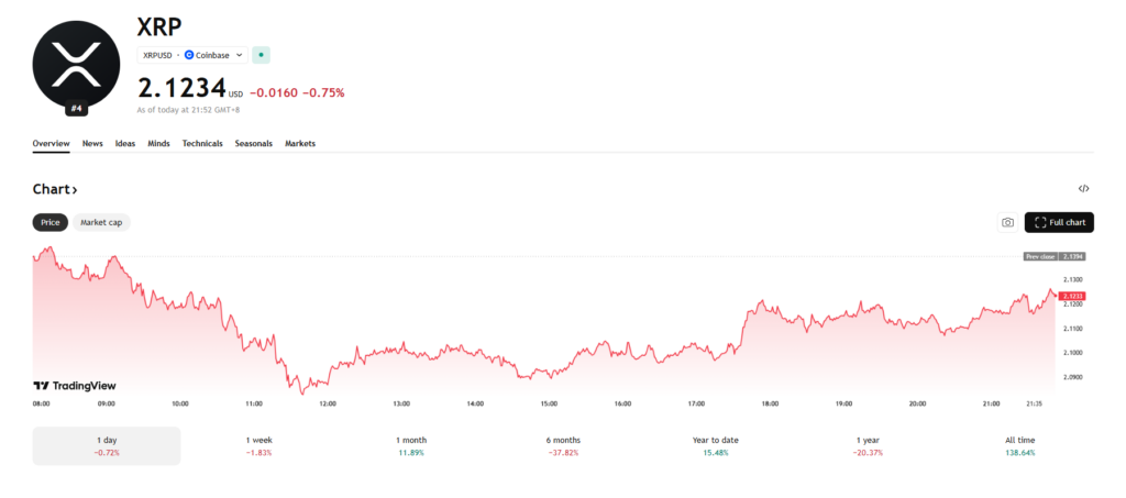 From a technical perspective, XRP’s rally pushed the price above key short-term indicators, including the 7-day and 30-day simple moving averages. Support has formed near $2.08, a level many traders see as critical for maintaining momentum. On the upside, resistance sits around $2.19, followed by $2.29 and $2.36 if buying pressure continues.