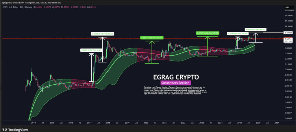 - EGRAG Crypto projects a 244% surge for XRP, possibly reaching $5.50–$6.00.