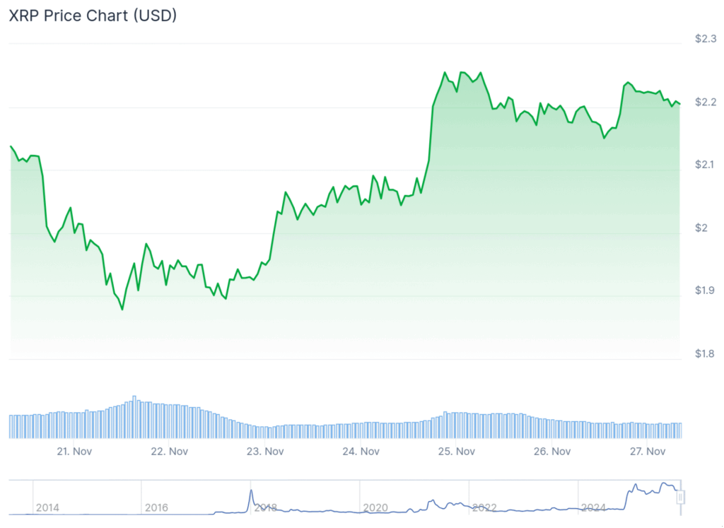 XRP kicked off the week with a burst of momentum, climbing above the $2.22 zone and tagging a high near $2.286 before slipping into a slower, more range-bound stretch. The move actually outpaced both Bitcoin and Ethereum early on, helped by a clean breakout over the $2.10–$2.12 region that had capped price for days. XRP now trades above $2.20 and the 100-hour SMA, holding a bullish trendline that sits around $2.18—basically acting as the first real safety cushion during pullbacks. Even after dipping below the 23.6% Fib level from its $1.817 swing low, price still clings to key support areas, which shows bulls haven’t stepped aside just yet.