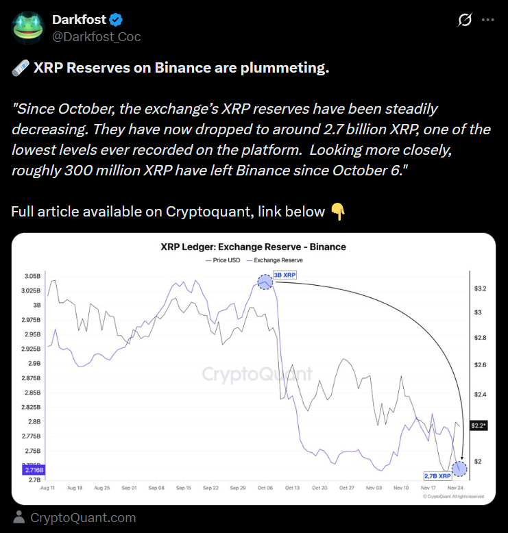 A major catalyst behind this momentum is the steep decline in Binance’s XRP reserves. On-chain data shows that the exchange now holds 2.7 billion XRP, one of its lowest levels ever. Roughly 300 million XRP exited Binance since October 6 alone. Exchange reserve drops typically signal accumulation—large holders withdrawing tokens into private storage rather than preparing to sell. This trend aligns closely with XRP’s recent price recovery, reinforcing the idea that demand is quietly building behind the scenes.