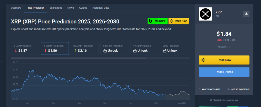 According to forecasts from CoinCodex, XRP is expected to reclaim the $2 mark around January 14, 2026. That move, however, may be short-lived, as the platform anticipates a pullback shortly after. CoinCodex then projects another attempt to move above $2 in late February 2026, indicating a choppy and uneven recovery rather than a clean breakout.