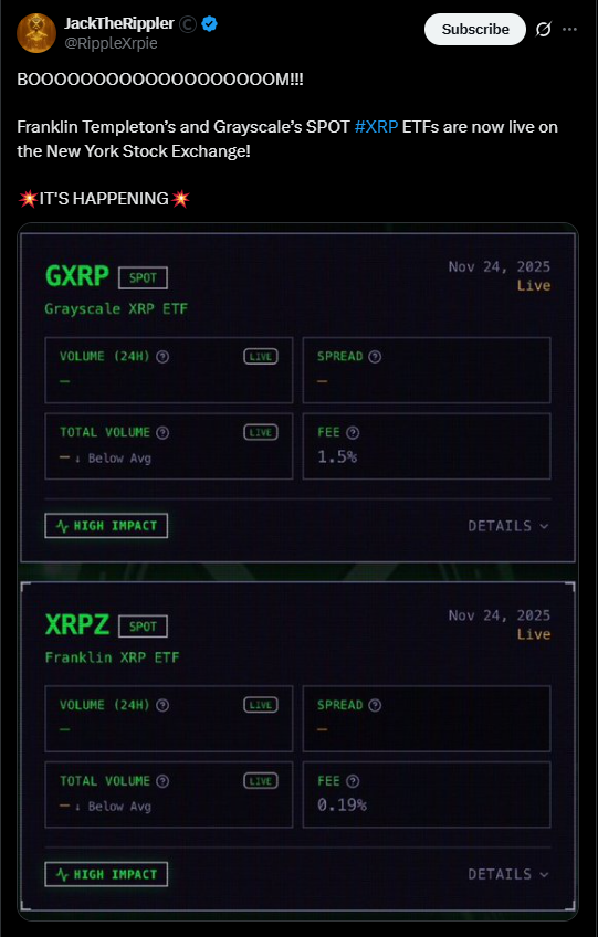 - Spot XRP ETFs from Franklin Templeton and Grayscale went live as XRP jumped nearly 9%.