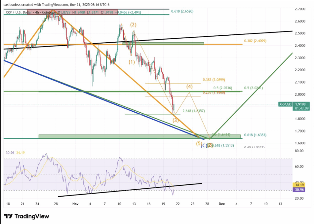 Casi notes that XRP’s first key breakdown happened when the price fell below the 0.5 Fibonacci retracement on Coinbase. That break opened the door for XRP to move deeper into extended Wave 3 support near $1.84 — and price hit that level almost perfectly.