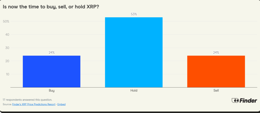 According to Finder’s expert panel, the majority view is pretty straightforward: hold. About 53% of analysts say investors should sit tight, expecting XRP to climb higher in the long run. Interestingly, the remaining experts are perfectly split — 24% say buy, and another 24% say sell — which shows just how muddy and uncertain the short-term path is right now. Roughly 35% also believe XRP is “fairly priced,” suggesting we’re stuck in a zone where neither bulls nor bears fully control direction.