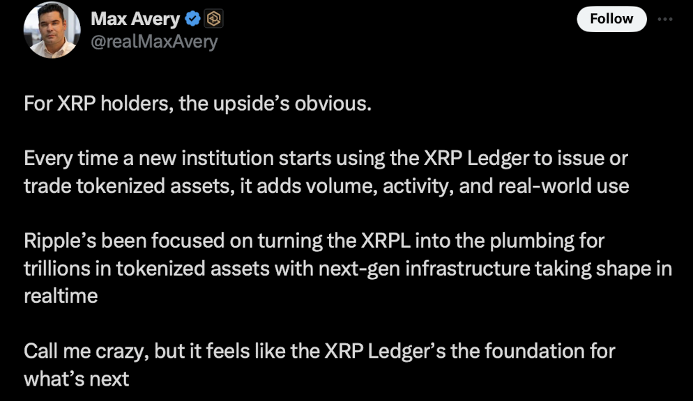 • XRP advocate Max Avery believes the XRP Ledger is positioned to power the real-world asset tokenization boom.