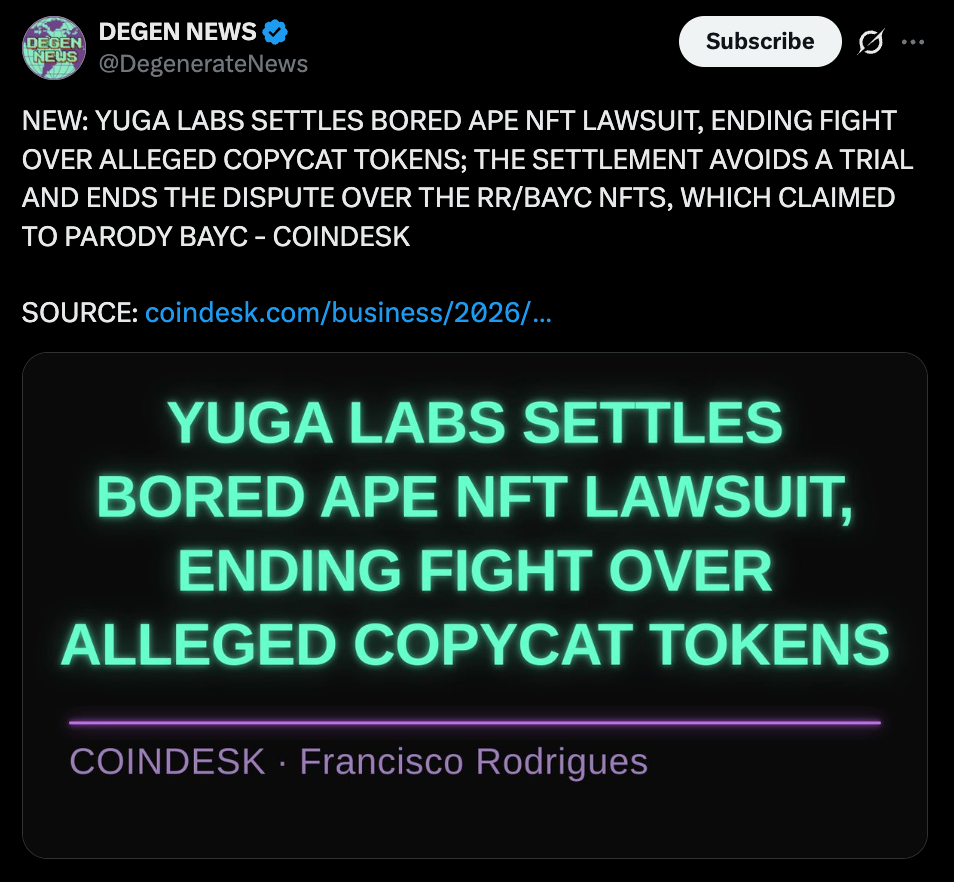 • Yuga Labs settles long-running NFT trademark dispute with RR/BAYC creators