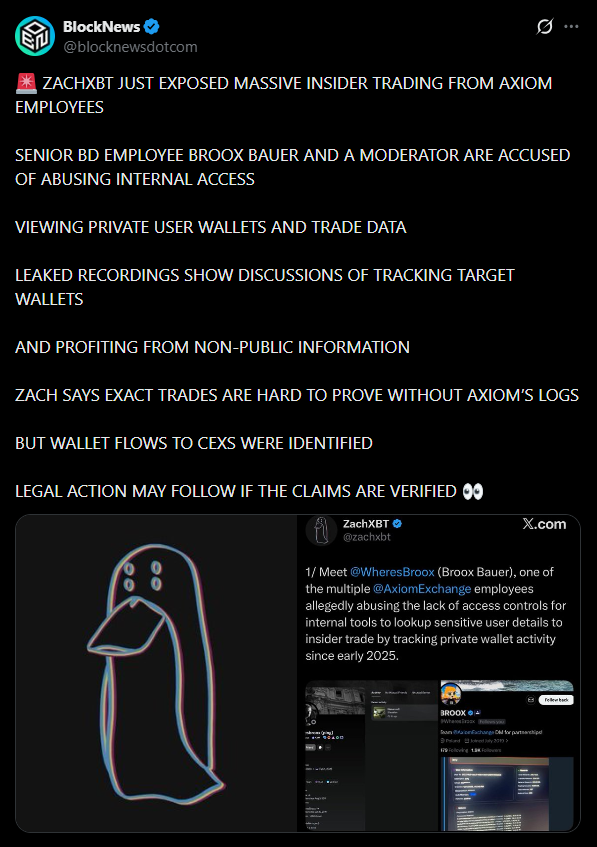 Blockchain investigator ZachXBT has alleged that an Axiom employee misused internal tools to monitor private user wallets and gain a trading edge. In a series of posts, he named Broox Bauer, a senior business development employee based in New York, as a central figure in the alleged scheme.