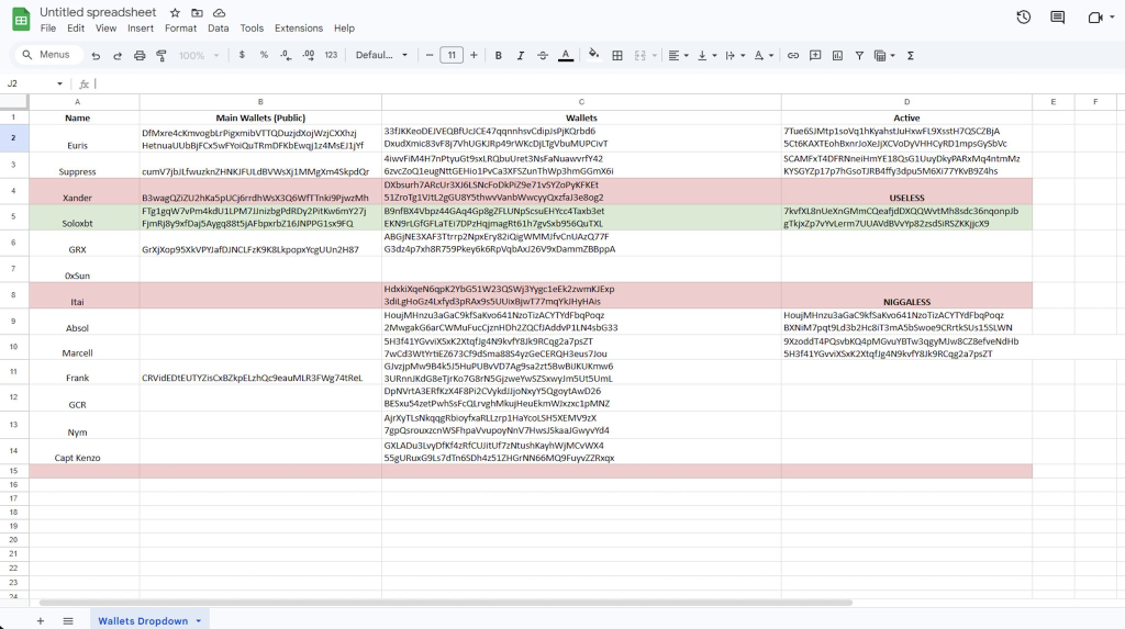 According to the report, members of the private group compiled a Google Sheet cataloging wallet addresses associated with targeted influencers. Several individuals later confirmed ownership of the listed addresses.