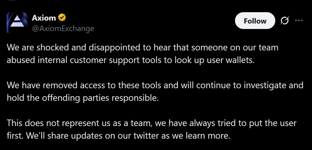 Axiom, founded in 2024 and operating prominently on the Solana blockchain, stated it was “shocked and disappointed” by the allegations. The company confirmed it has launched an internal investigation and removed access to the tools in question.
