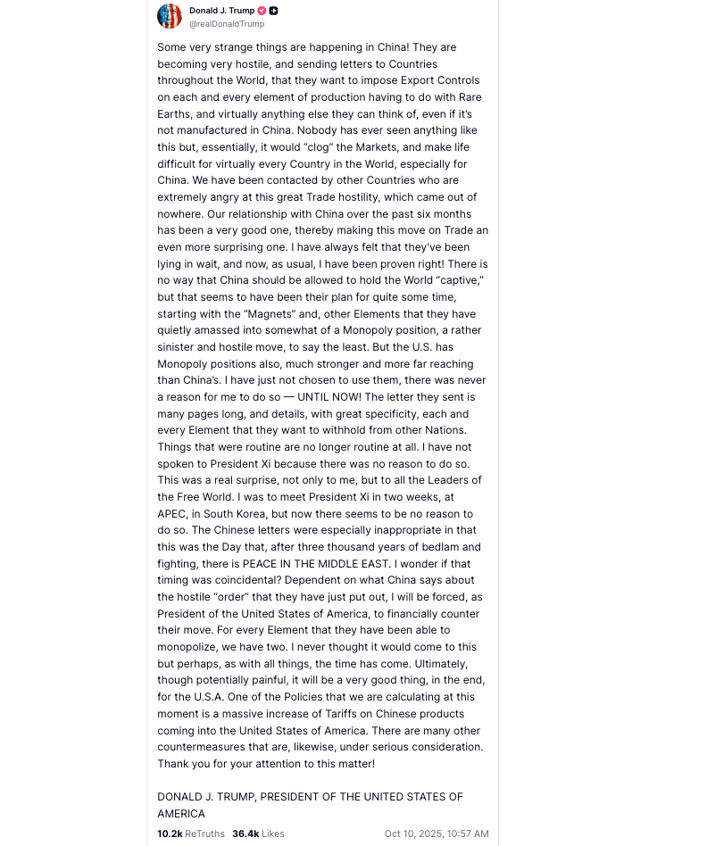It’s wild how much power two social media posts can have. In his first message, Trump blasted China’s new export limits on rare earth minerals—materials essential for batteries, semiconductors, and military tech—calling them “hostile” and warning they’d “clog” global trade. Over 90% of those minerals come from China, according to Reuters, so that message alone rattled investors worldwide.