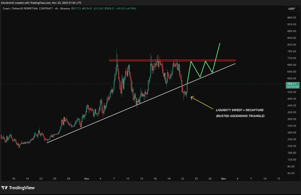 The 4H chart looks wild. ZEC briefly dipped under its ascending trendline — a classic stop-hunt move that washed out weak hands — before snapping right back above the line. According to analyst Ardi, this is a “busted ascending triangle,” where price fakes a breakdown, grabs liquidity, then reverses with even more force.
