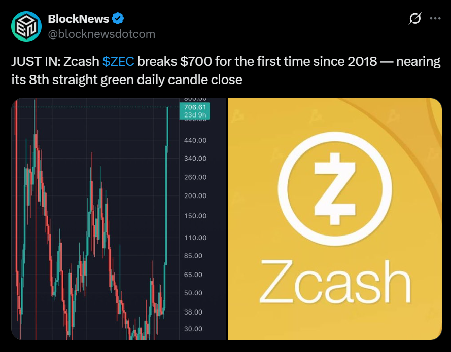 - Zcash (ZEC) hit a $10.6B market cap, outperforming Monero and other privacy coins.