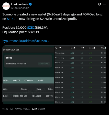 - An anonymous trader made about $2.7 million in unrealized profits as ZEC’s network hit record hashrate levels.