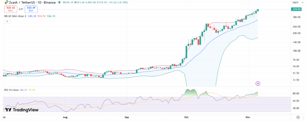 The charts look strong, but maybe a bit too strong. On the daily timeframe, ZEC’s price is hugging the upper Bollinger Band — usually a sign of strong bullish energy, but also a caution that things might be getting overheated. The RSI has also soared past 70, signaling overbought conditions. If the rally cools off, the nearest support sits around $450, with a firmer safety zone between $390 and $400. On the upside, if the bulls keep pushing, resistance levels at $550 to $580 are next, and a breakout from there could take the coin as high as $620 or beyond.