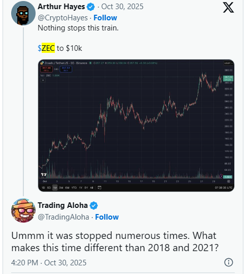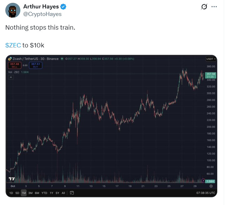 Zcash (ZEC) is on fire again. The privacy coin jumped 15% in just over a day, hitting $362 after BitMEX co-founder Arthur Hayes once more dropped his now-famous prediction: ZEC to $10,000. His post on X simply read, “nothing stops this train,” reigniting speculation across the crypto community. Trading volume also spiked 45% to nearly $800 million as traders piled in.