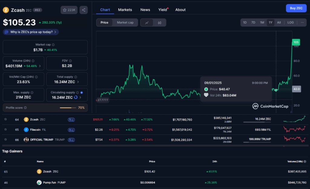 Zcash has been on a tear lately, breaking above $100 and catching the eye of both traders and everyday Google searchers. The coin now sits around $105, riding a staggering 292% gain in the past year and a 159% spike just this past month. Yet despite this run, Zcash still flies under the radar on big crypto trackers like CoinGecko and CoinMarketCap, leaving plenty of people surprised by its sudden climb up the charts.